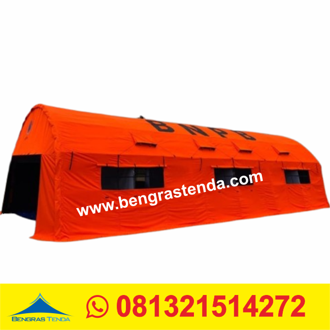 Tenda BNPB/BPBD merupakan tenda yang menggunakan rangka pipa besi (black steel) dengan sistem knockdown dan portable yang praktis untuk dibawa kemana saja. Tenda BNPB/BPBD ini merupakan tenda multifungsi yang sering digunakan untuk pos pengungsian, seperti untuk pelayanan kesehatan. Tenda BNPB/BPBD yang kami produksi memiliki 3 jenis bahan yaitu bahan filamin, bahan cordura dan bahan D300 soft. Dengan komponen, tiang penyangga, tiang samping dan konektor penghubung. Keunggulan yang dimiliki oleh tenda BNPB ini adalah tahan air (waterproof).